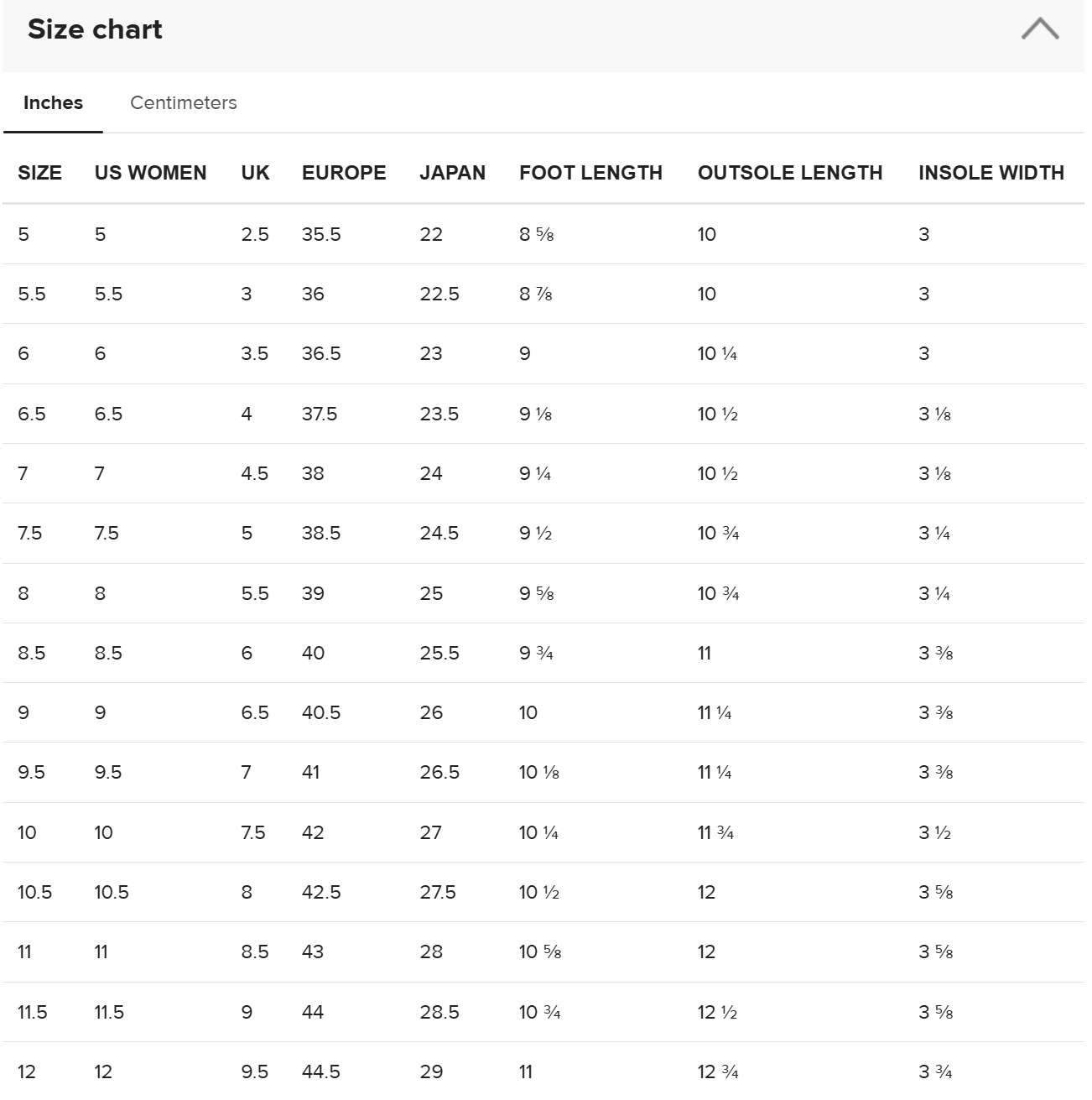 The outsole design varies by size. Sizes 37.5–40 feature a point-like pattern, while sizes 40.5–47.5 have stripe detailing.