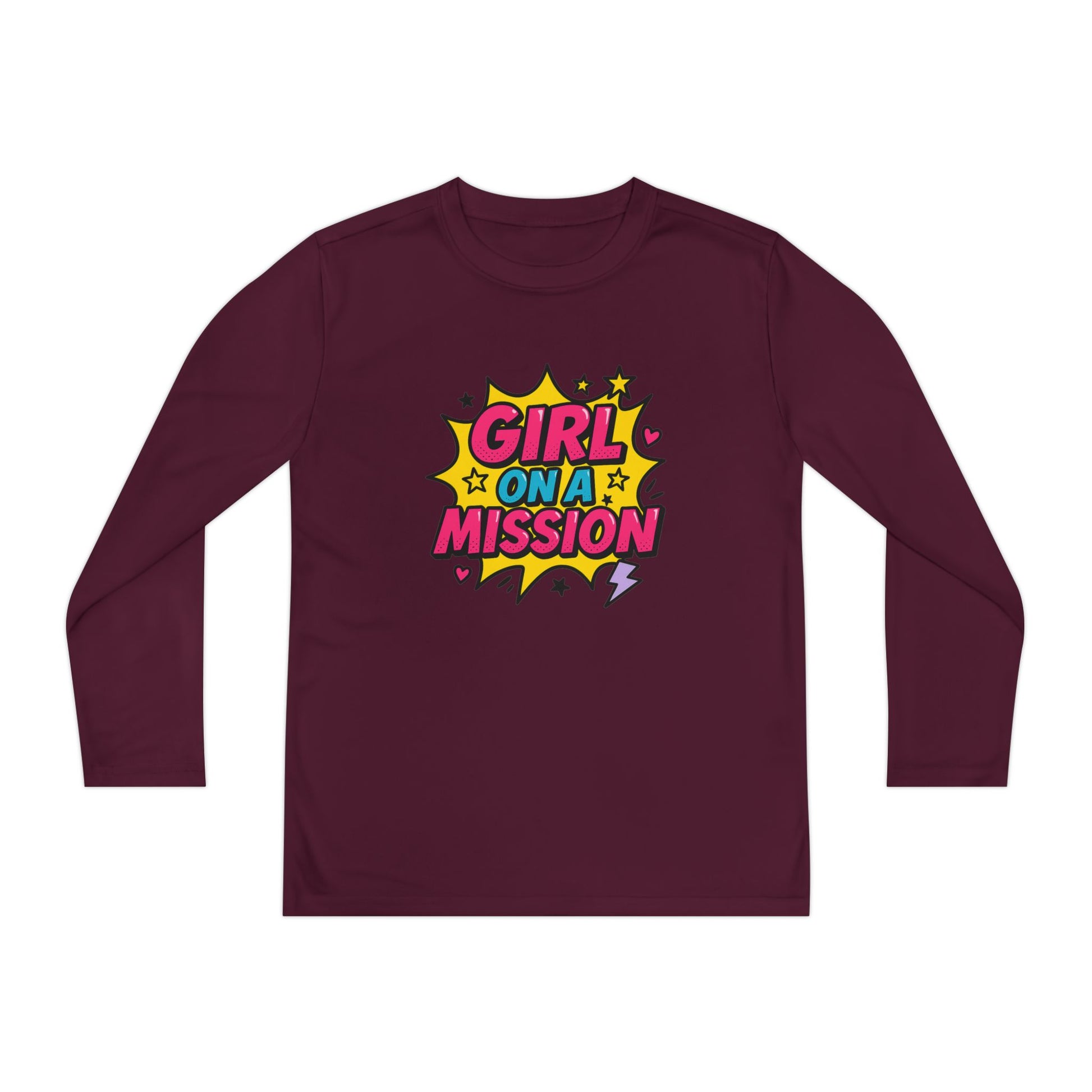 Empower the next generation with the Girl on a Mission Youth Long Sleeve Tee — a bold, motivational shirt designed for girls who dream big and move with purpose. Made from lightweight, moisture-wicking polyester, this tee keeps up with active days at school, on the field, or hanging out with friends. The bright pop-art inspired design brings confidence and color to any outfit, making it a must-have for expressive, goal-driven youth.