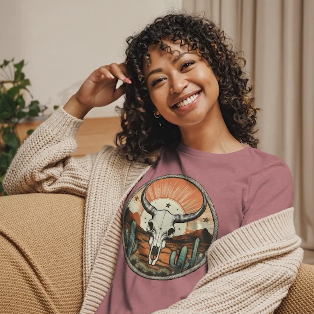 Step into western charm with the Steer Skull Sunset Women’s Relaxed T-Shirt — soft, flattering, and full of rustic personality. This vintage-inspired cowgirl tee features a detailed steer skull badge framed by a rope border and desert sunset hues, blending timeless western grit with feminine style.