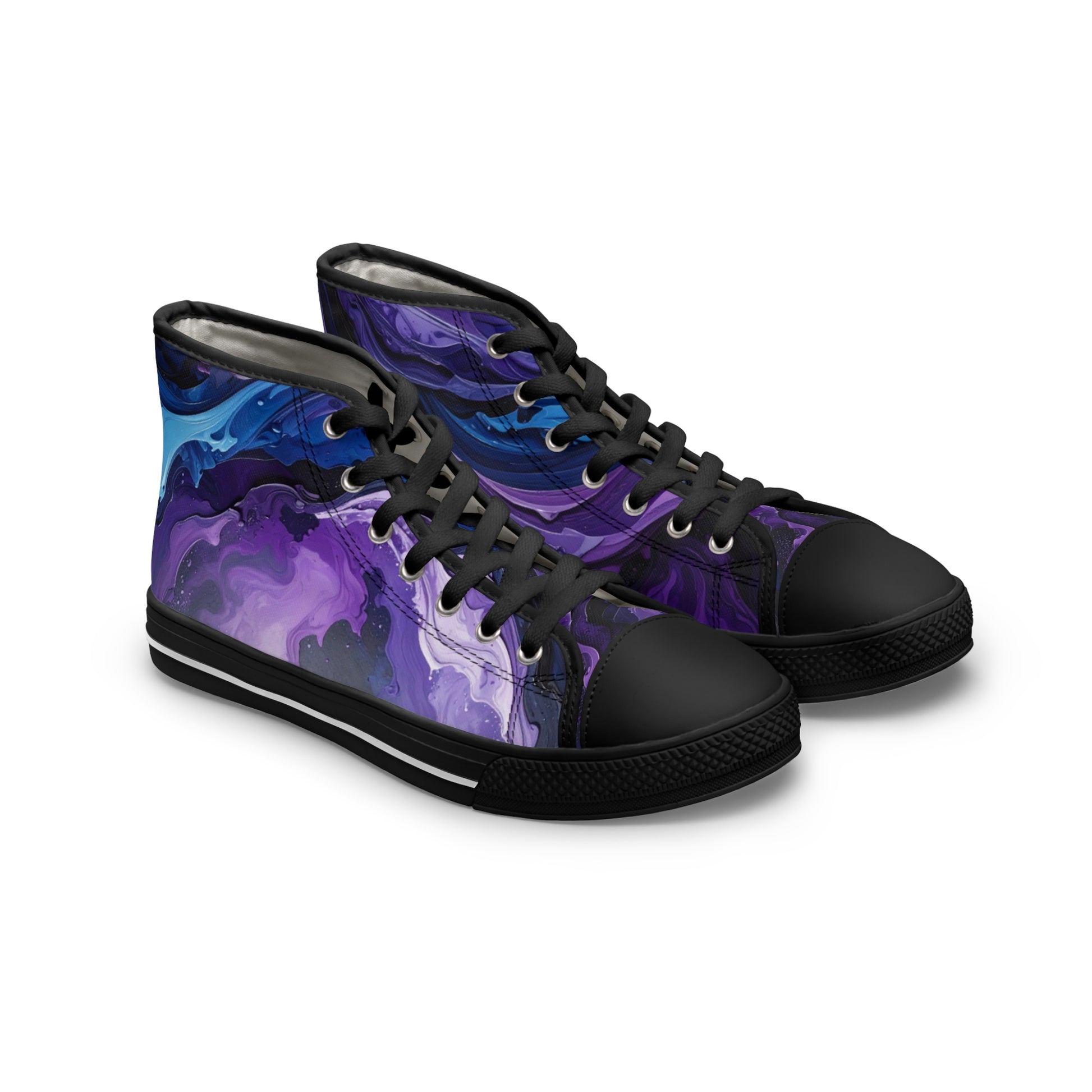 Make a bold fashion statement with these Women’s High Top Sneakers, designed with a stunning abstract swirl pattern in purple, dark blue, and black. Perfect for adding personality to your casual looks, these high tops combine comfort and style for everyday wear.